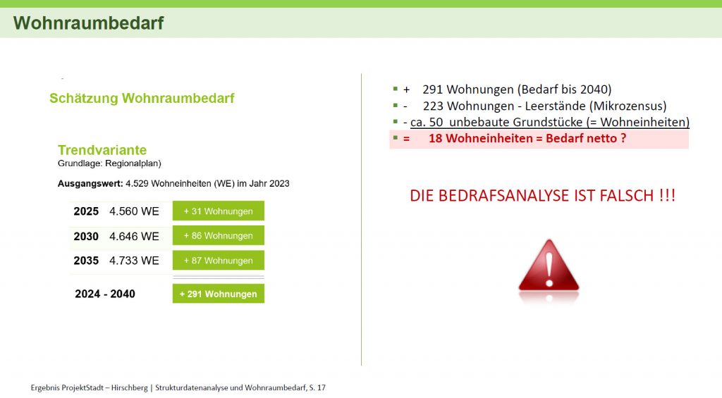 In Hirschberg gibt es ausreichend Leerstände, allein im Sterzwinkel sind über 30 Grundstücke vorhanden. Auch hier hat die Kommune eine falsche Planung angesetzt, in anderen Gemeinden kauft diese allen Grund auf und sorgt so für zeitnahe Nutzung und Bebauung. Theoretisch könnte dies immer noch geschehen, der Kommune stehen diverse Mittel zur Verfügung. Ungenutzte Einheiten führen zu Verlusten bei der Kommune, denn die Infrastruktur muß vorgehalten werden, es gibt aber keine Einnahmen (außer die Grundsteuer). Dies ist auch ein Zeichen von verfehlter Haushaltspolitik. Ferner schreibt der Regionalplan bei der Berechnung des Bedarfs vor, daß das Potential der Innenentwicklung in Abzug gebracht werden muß. Das scheint bei der Analyse nicht berücksichtigt.